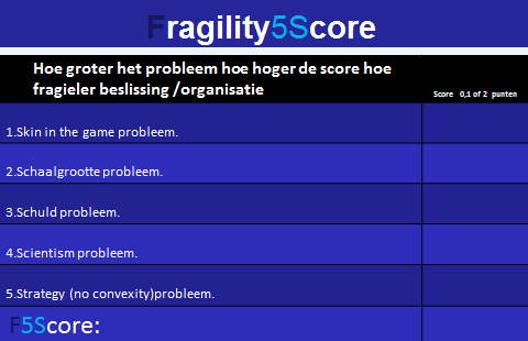 De Fragility5Score is een checklist, in lijn met de APGAR-score/checklist bij een geboorte van een kind, en levert een bijdrage aan inzicht en betere besluitvorming. Dit is naast het werk van N.N. taleb ondermeer gebaseerd op het ‘Checklist Manifesto’ van Atul Gawande en ‘Thinking Fast and Slow’ van D. Kahneman. Uitgangspunt is dat ‘Survival’ belangrijker is dan ‘Succes’ . De F5Score probeert een te groot vertrouwen in wetenschap en scenarioanalyses te compenseren; rationaliteit is juist niet gelegen in data-analyses, machine learning, AI etc…