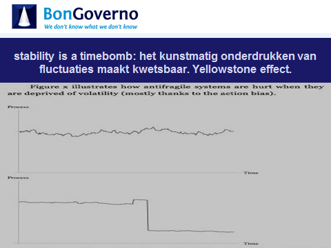 Een kunstmatige stabiele omgeving kan minder goed omgaan met (grote) veranderingen. Een organisch volatiel systeem reageert beter op veranderingen; de actoren in het systeem zijn in staat om te gaan met stressfactoren. Volatiliteit leidt dus juist tot stabiliteit. En variatie geeft informatie aan systemen en/of de organisaties/ondernemingen, die daardoor beter kunnen omgaan met stress en (grote) veranderingen.